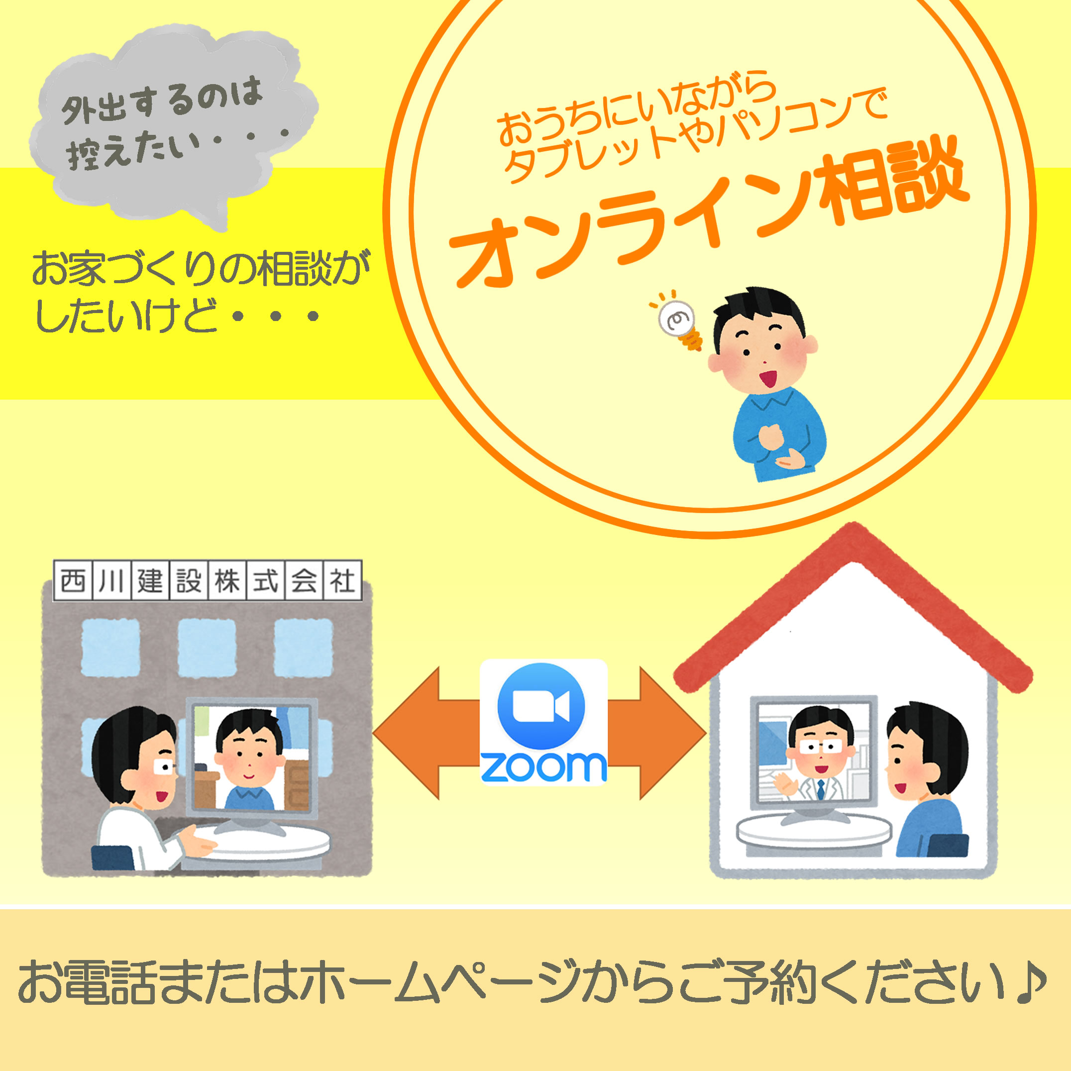 西川建設では、新型コロナウィルスの感染拡大により、外出を控えている方、外出が困難な方に、電話以外にもお家にいながらインターネットを介して、テレビ電話のような形で会話のできる、zoom(ズーム)というアプリを使ったオンライン相談を実施しております。
