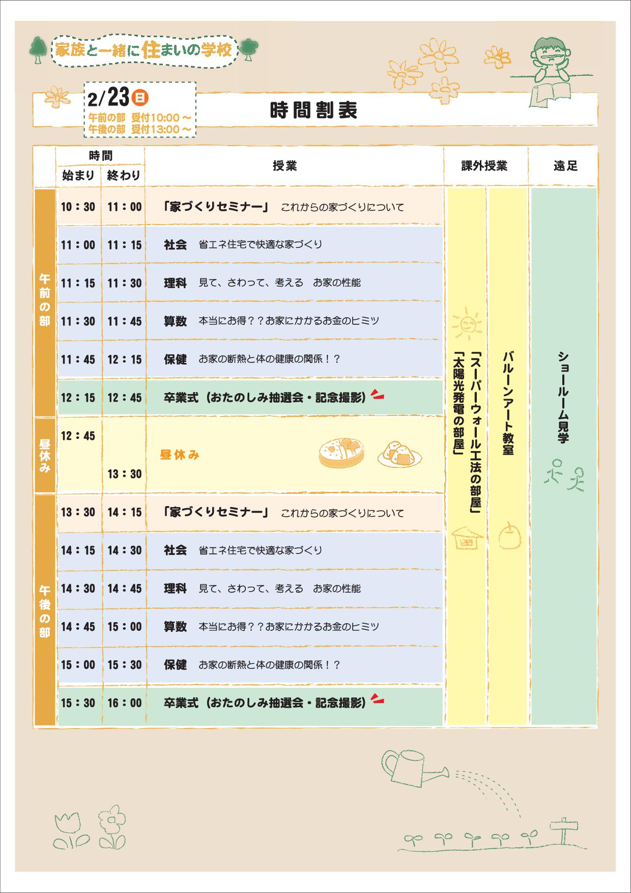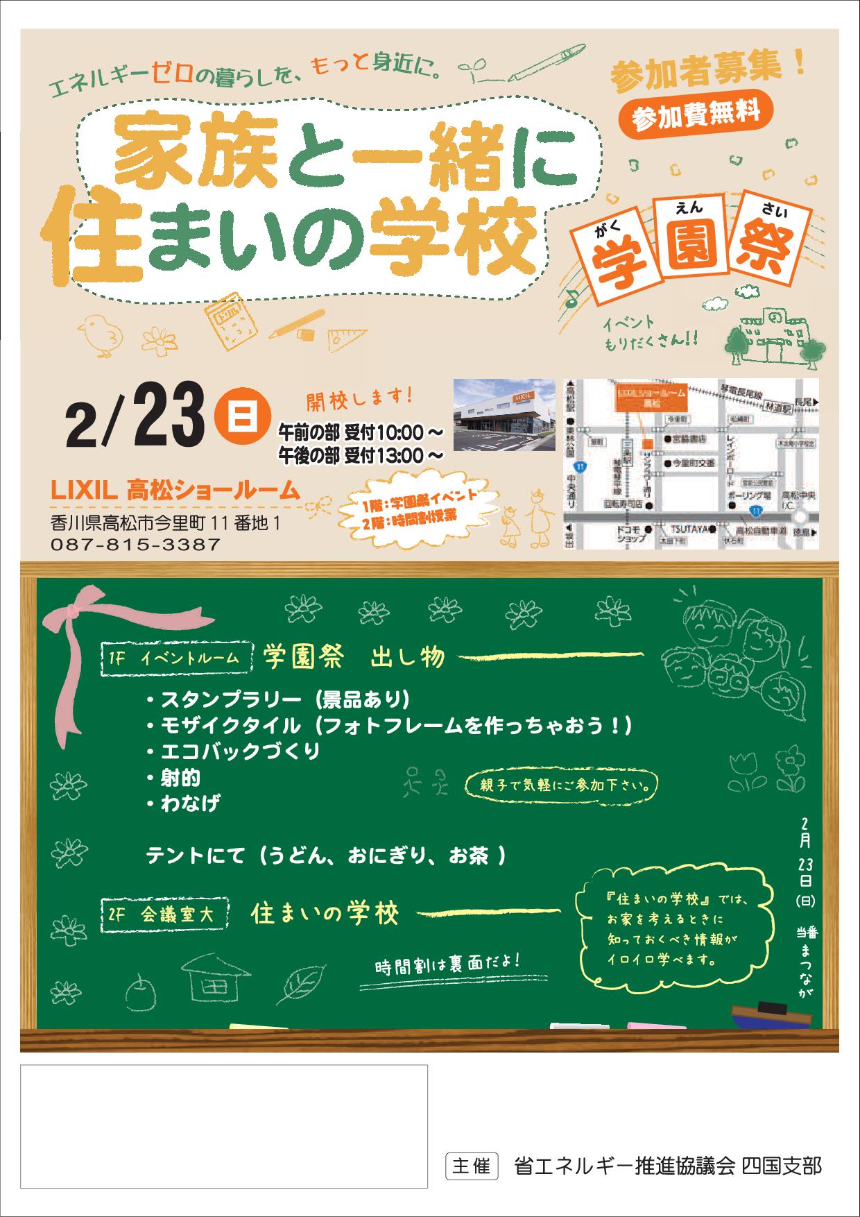 こんにちは。西川建設 久保本です。 2月に『住まいの学校』を開催することになりました。お家を考える上で知っておくべき情報がたくさんです! 今回は『学園祭』!!縁日コーナーやワークショップなどもありますので、お子様にも楽しんでいただけると思います *クリックで拡大します OB様も大歓迎ですどうぞお気軽にご家族でご参加ください 日時:2月23日(日) 場所:LIXIL高松ショールーム 香川県高松市今里町11番地1 参加にはお申し込みが必要となります。 お問い合わせ、お申し込みは 西川建設 久保本までご連絡ください。 お電話でもメールでもどちらでもOKです!お待ちしております!