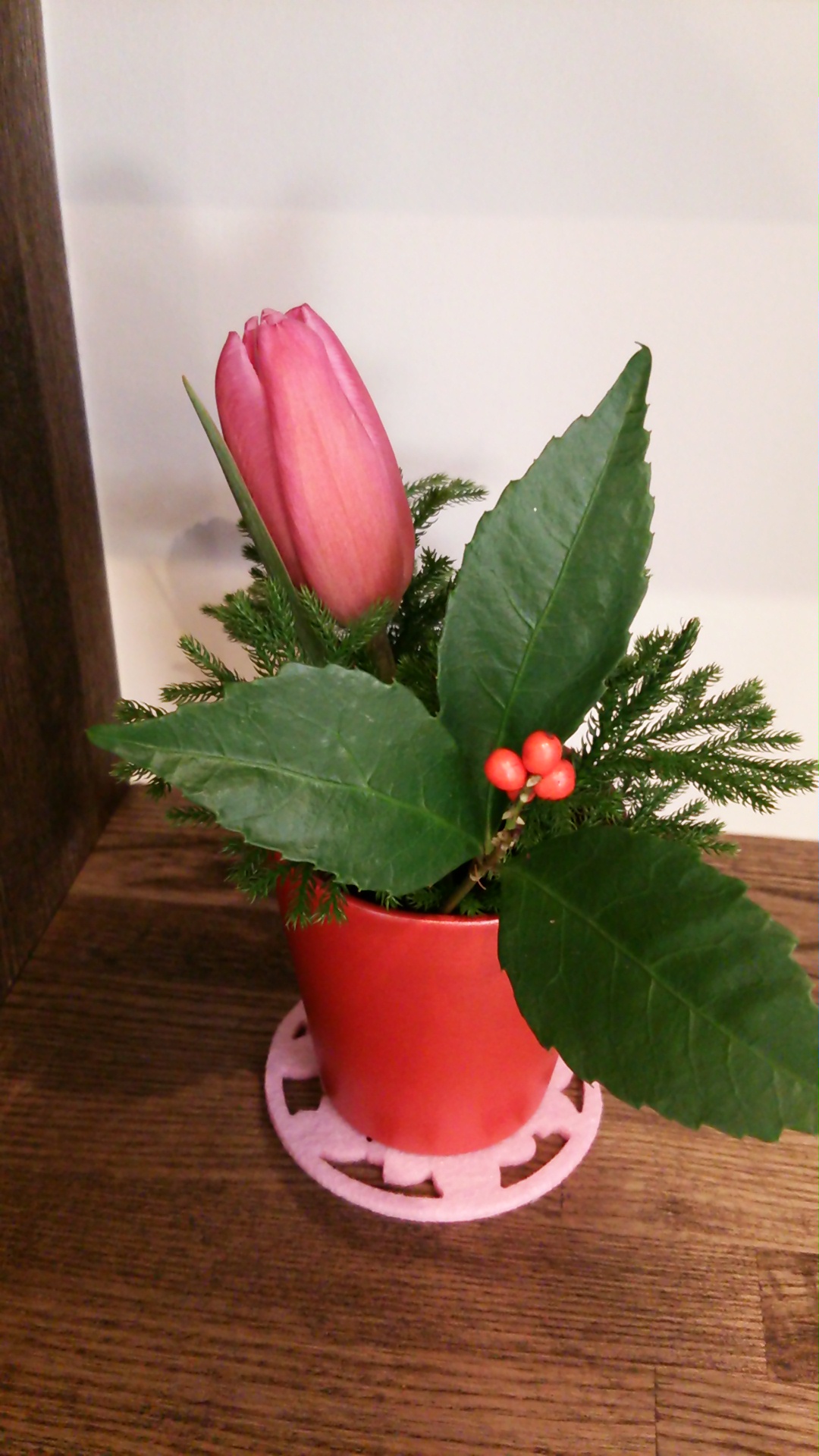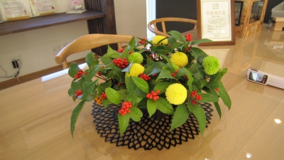 リビングのテーブルの上。いただきもののたっぷりの千両とピンポン菊です。