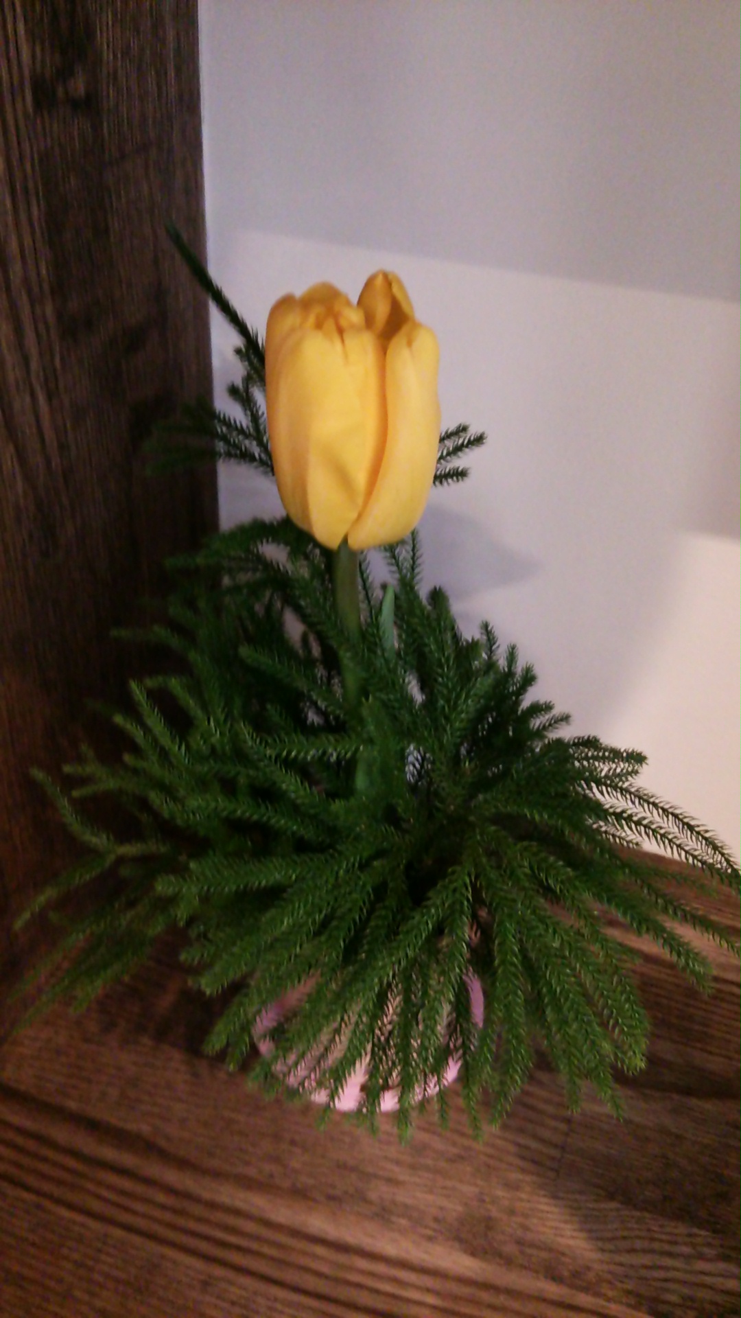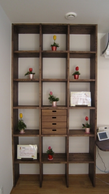 大工さんお手製の床から天井までの多機能棚。小さな花器にかわいいチューリップを入れランダムに置いてます。