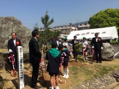 三島体育館前の庭に県知事さんとボーイスカウトの子供たちで