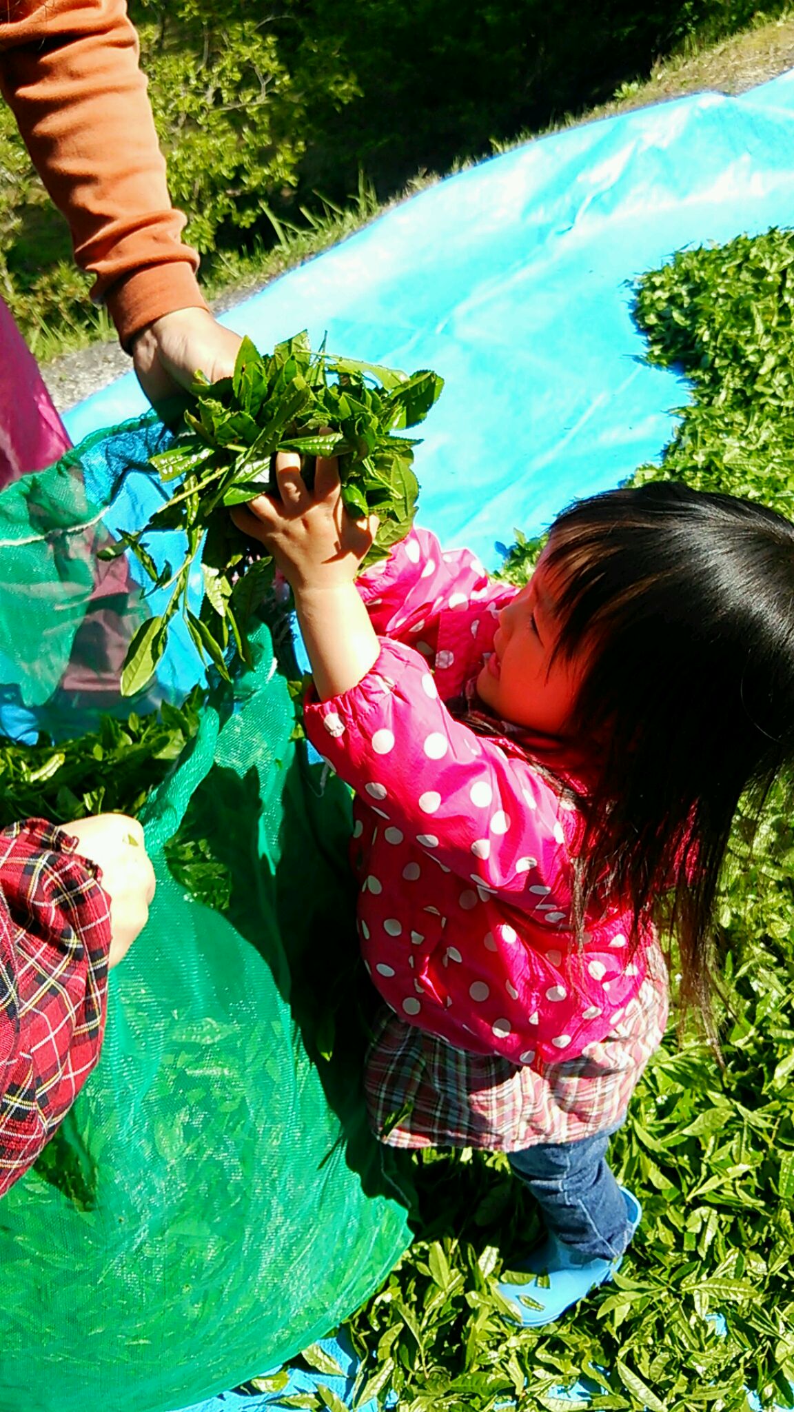 お茶工場へ運ぶために大きな袋に詰め込んだり・・・