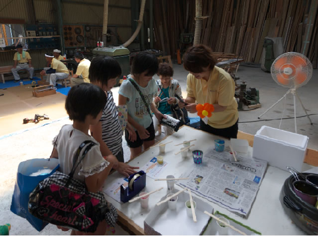 タイルアートやキャンドル作りではオリジナルのフォトフレームやキャンドルを作って、大工さんと一緒の木工体験も人気でした♪