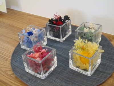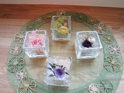 小さなガラスの花器にプリザーブドフラワーのバラの花を入れました。