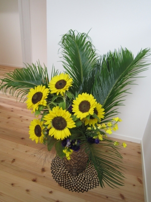 ひまわり・トルコキキョウ・オンシジウム・会社に植えてあるソテツ