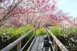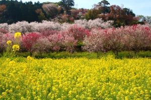 菜の花の黄色と満開の花桃のピンク、山の緑とのコントラストは遠くから見ても圧巻!