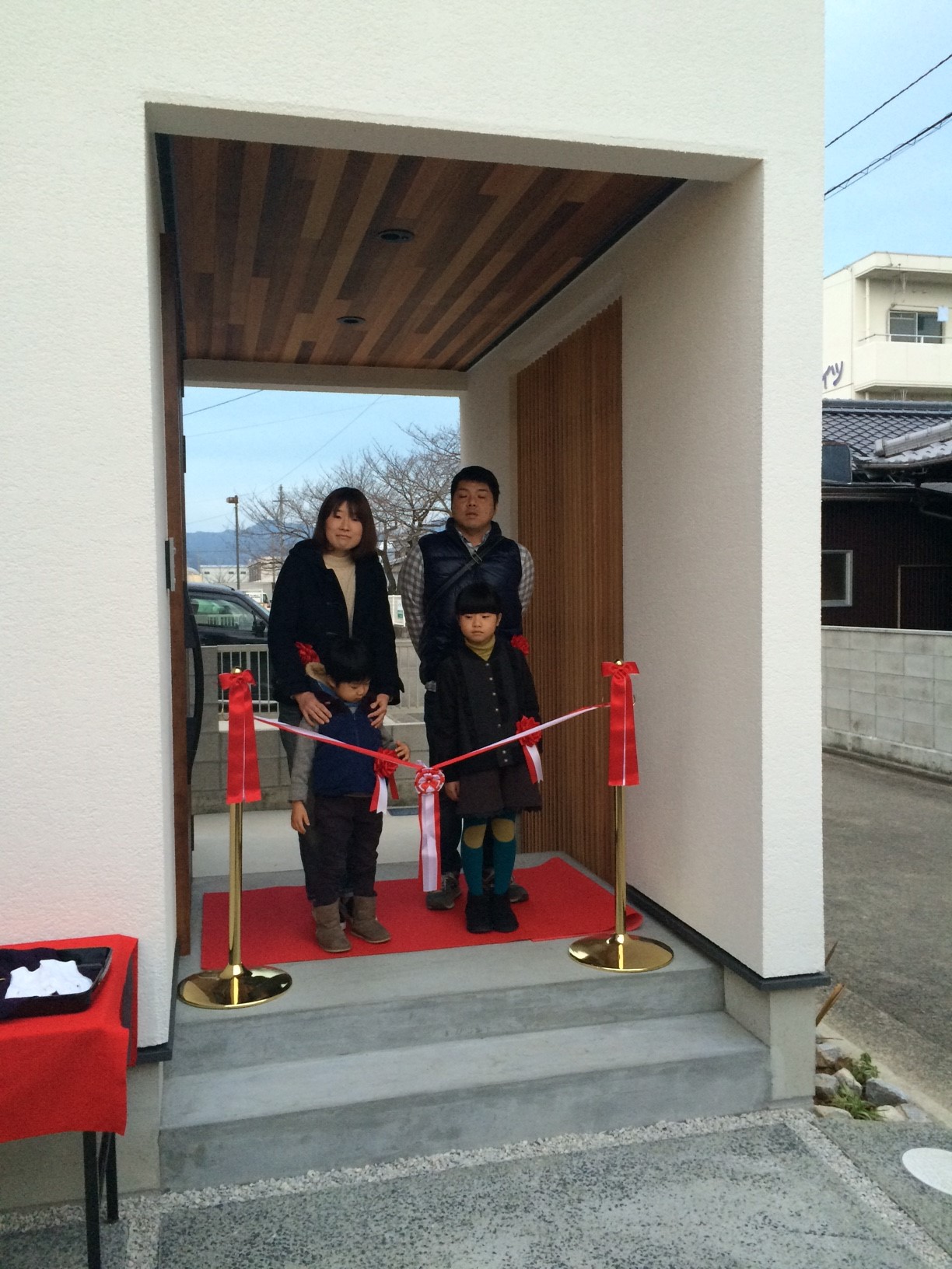 テープカットと玄関ドアに鍵入れを行い