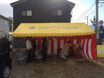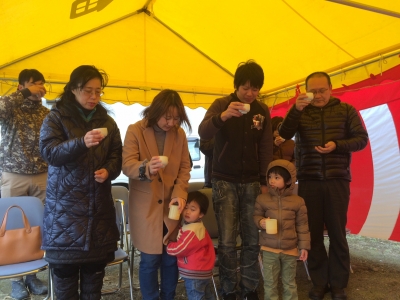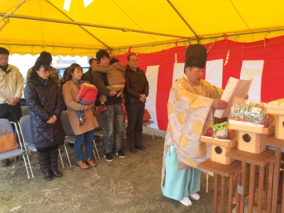 雪がチラつく中、金生町下分にて地鎮祭をとり行いました。