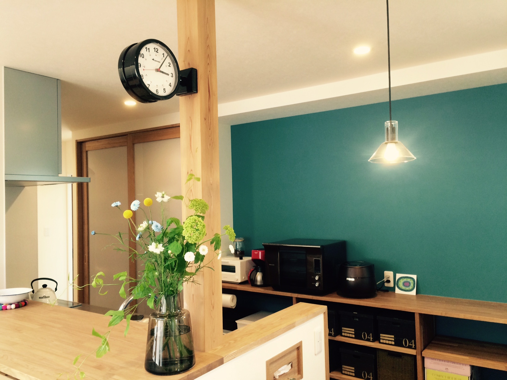 見学会でも好評だった、ターコイズブルーの壁もアクセントになっていました。