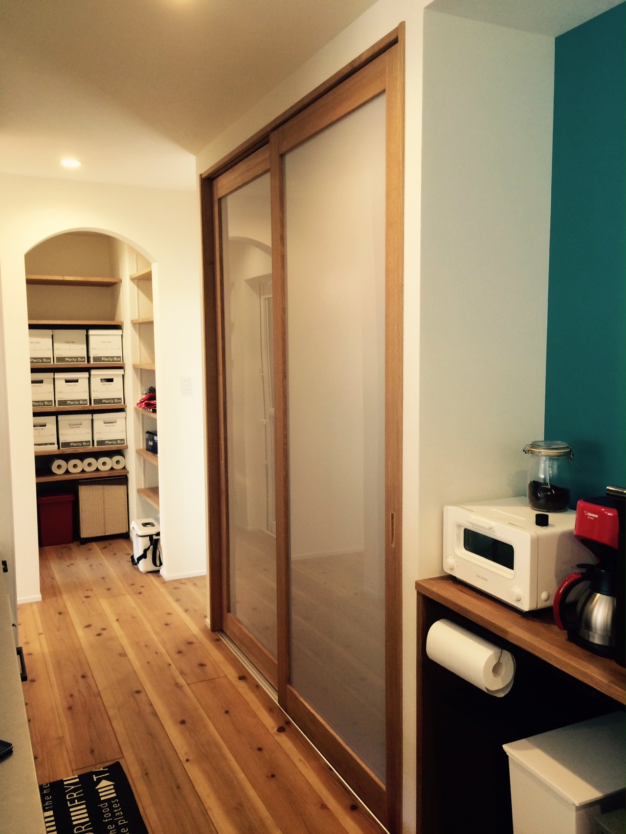 造作建具の食器棚にパントリーのアール壁もやっぱりオシャレです。