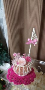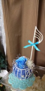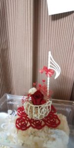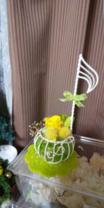 音符のワイヤー花器にいろいろな色のバラを入れてみました。