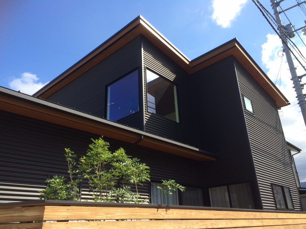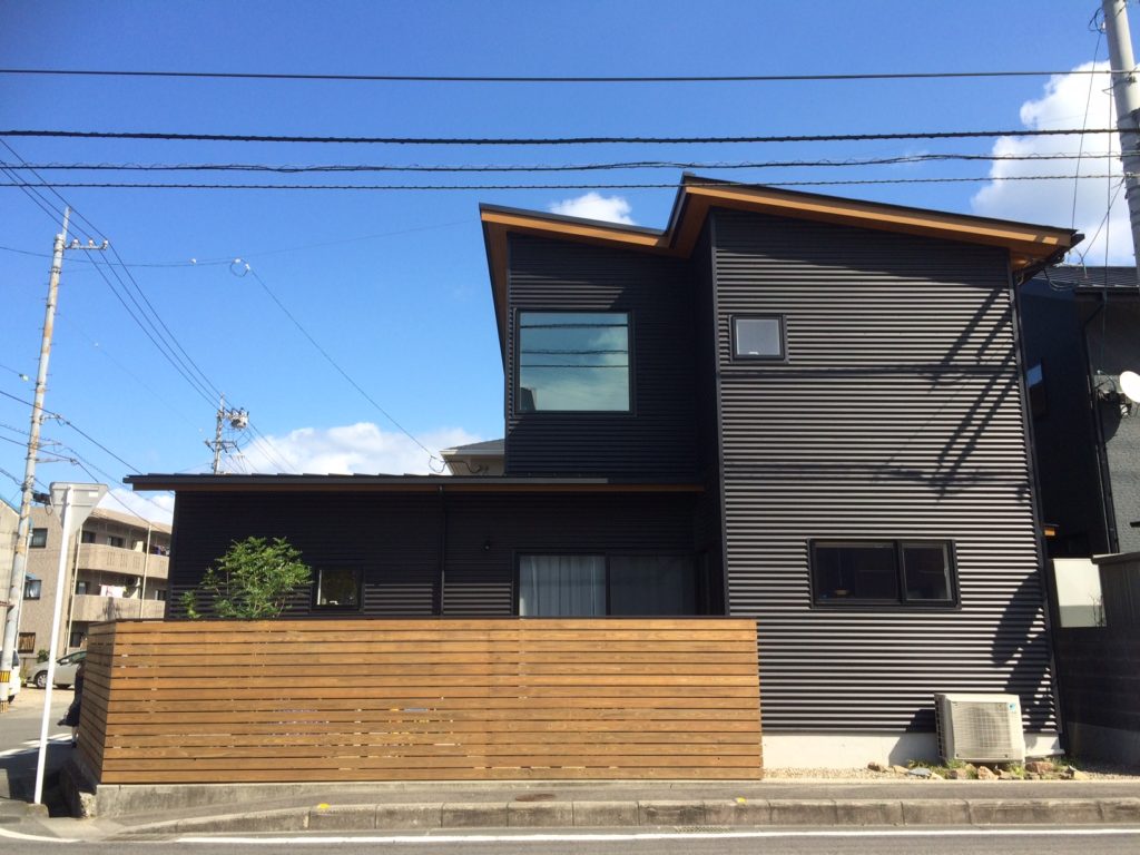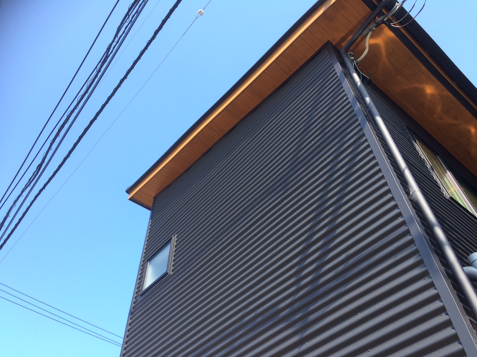 大波のガルバリウム鋼板の外壁と木製フェンスとのバランスがカッコいい外観です。