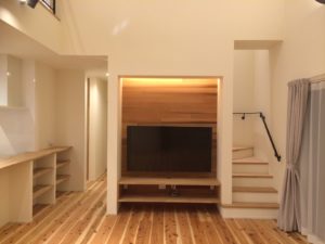 テレビは壁掛けで背面には最近人気のレッドシダーを貼ってリビングのアクセントに。