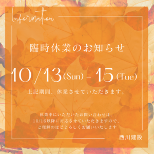 臨時休業期間 10月13日(日)・14日(月・祝)・15日(火)